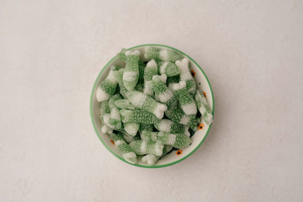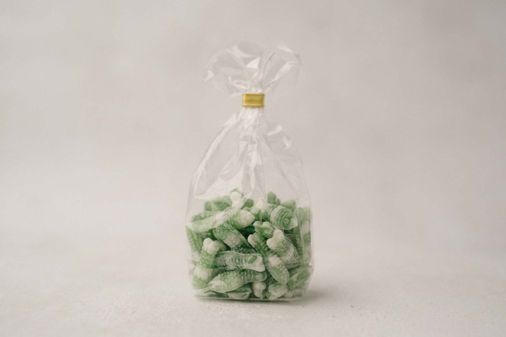 Zucker, Glukose, Weinsteinsäure, natürliches Aroma, Farbstoff: Chlorophyll E141, echtes Karmin E120.